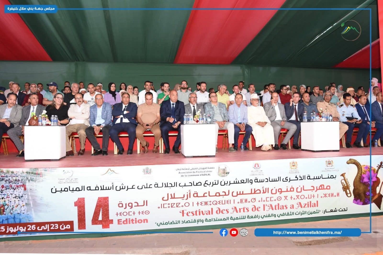 أشرف السيد عادل البراكات رئيس مجلس جهة بني ملال- خنيفرة، الى جانب السيد عبد اللطيف حلويت الكاتب العام لعمالة اقليم ازيلال، وكل من السيد رئيس المجلس الاقليمي لازيلال، والسيد رئيس مجموعة الجماعات الترابية للاطلسين الكبير والمتوسط، و رئيس مجلس جماعة أزيلال وبحضور بعض السيدات والسادة اعضاء مجلس الجهة، و ورؤساء المصالح الامنية، والمصالح اللاممركزة، ورؤساء الجماعات الترابية بازيلال، يوم الأربعاء 23 يوليوز 2025 ، على افتتاح فعاليات النسخة الرابعة عشر للمهرجان الصيفي لفنون الأطلس.