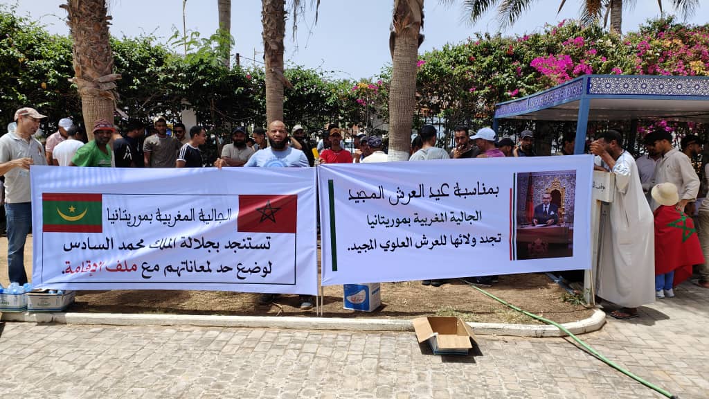 نظمت العشرات من أفراد الجالية المغربية المقيمة في موريتانيا، يوم الثلاثاء 29 يوليوز 2025، وقفة احتجاجية أمام السفارة المغربية بنواكشوط، رفعوا خلالها شعارات تُطالب بتدخل جلالة الملك محمد السادس من أجل إيجاد حل نهائي لمعاناتهم مع ملف الإقامة ورسومها السنوية المرتفعة. وتأتي هذه الخطوة بعد أشهر من تشديد السلطات الموريتانية إجراءاتها على الأجانب، من خلال حملات تفتيش وترحيل شملت كل من لم يسوِّ وضعه القانوني أو يُسدد الرسوم كما ينص عليه القانون الموريتاني. وتؤكد الجالية المغربية أن هذه الإجراءات تسببت في معاناة كثيرة للأسر المغربية وتهدد مصدر رزقها، مطالبة بتدخل عاجل من السلطات المغربية وفتح حوار دبلوماسي بين الرباط ونواكشوط لوضع حد للمشكل في احترام لحقوق المهاجرين والقوانين المحلية.