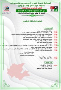 ينظم المكتب الجهوي للفيدرالية المغربية لناشري الصحف بجهة فاس مكناس،صباح غذ الجمعة فاتح يوليوز 2022 بمدينة إفران ،لقاءا دراسيا تحت شعار :” أي دور للإعلام في التنمية الجهوية” بشراكة مع المجلس الاقليمي لافران، و بمشاركة المكتب التنفيذي ومجلس جهة فاس مكناس، و المديرية الجهوية لوزارة الثقافية والشباب والتواصل قطاع التواصل، وممثلي القطاعات السياحية والغابوية والشبابية بالمدينة،وذلك حسب البرنامج التالي :